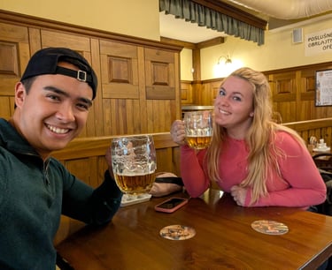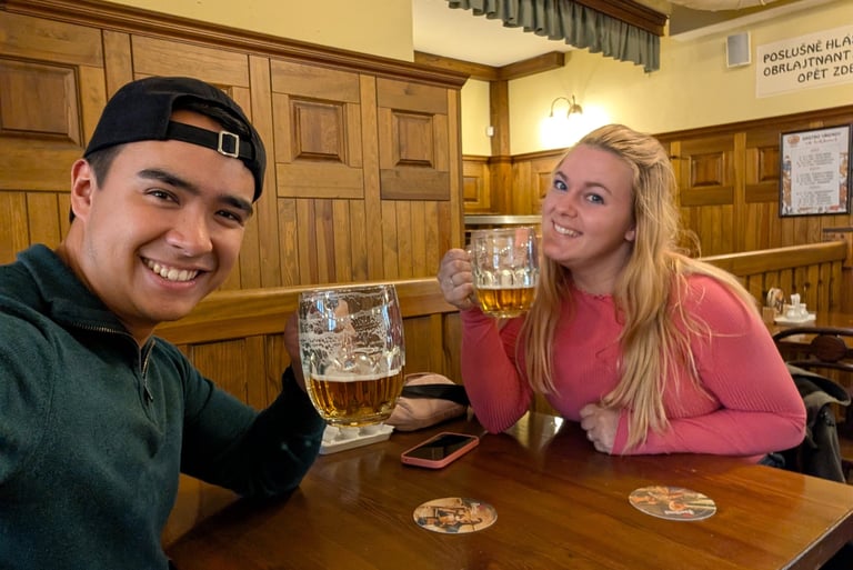Sunday brought us into the Czech Republic, with our first planned stop: Pilsen. Anne had never been to the Czech Republic before, and she didn’t quite know what to expect. But it became clear quickly: the roads worsened, signs became unreadable, and diesel prices dropped significantly. Pilsen didn’t really charm us. Sure, we had a local beer, but the city felt grey, rainy, and a bit bleak. To top it off, our water ran out, and we couldn’t refill it without Czech coins. So yeah, not the most glamorous evening.